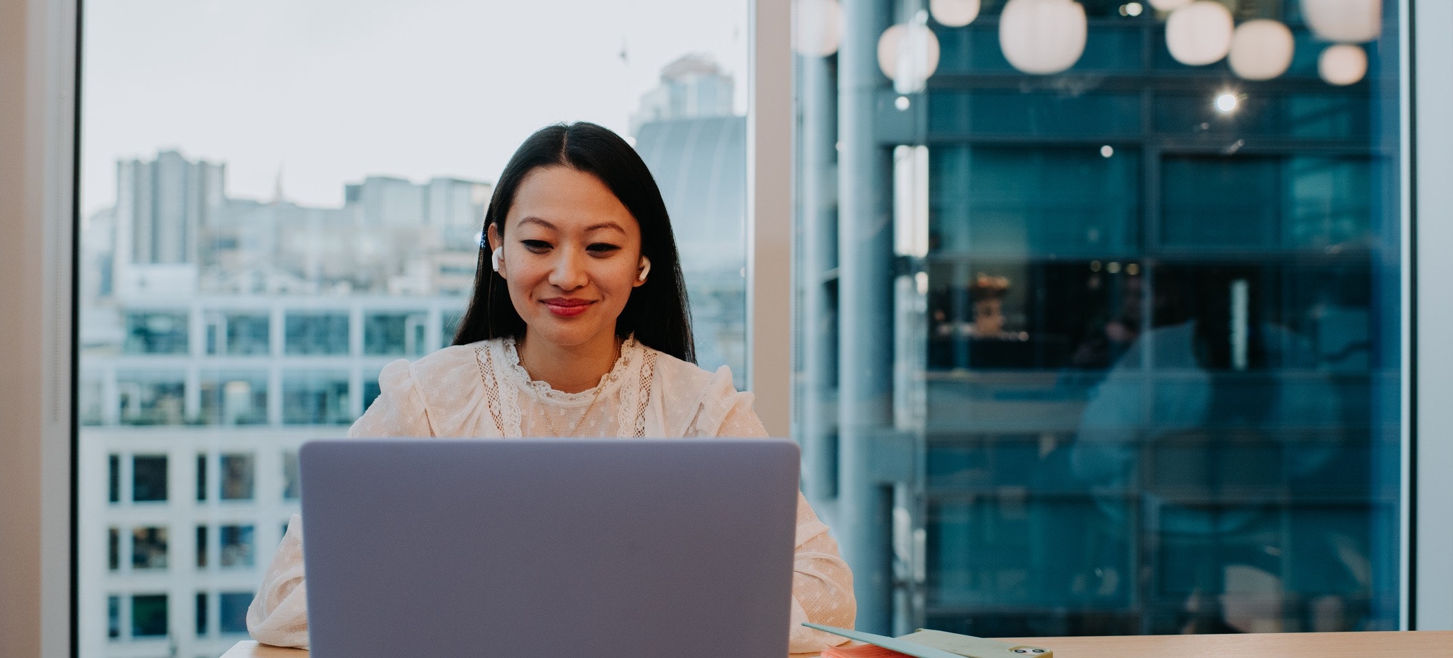 [Featured image] A front-end developer is in an office working on their laptop with earbuds on.