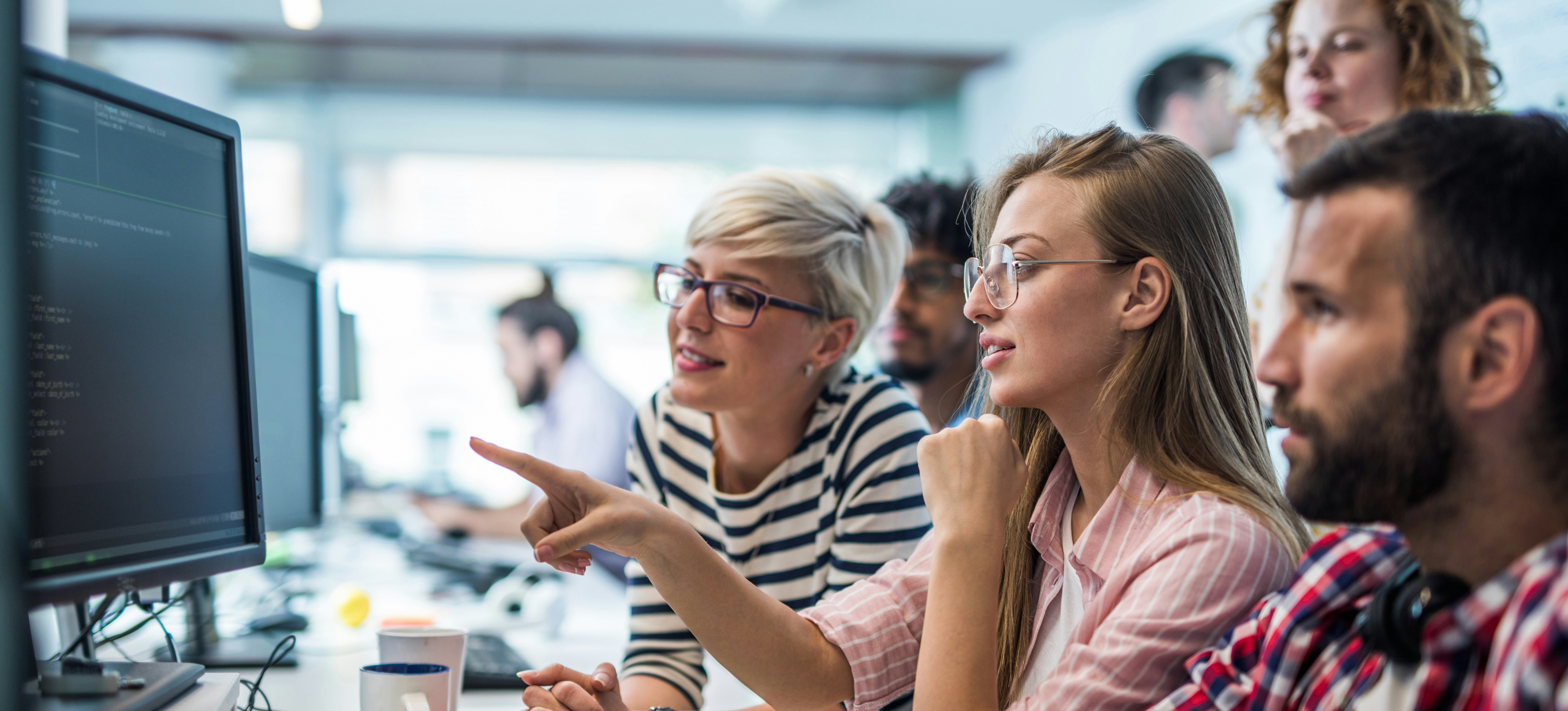 [Featured Image] Three web developers look at a computer monitor with django coding on it.