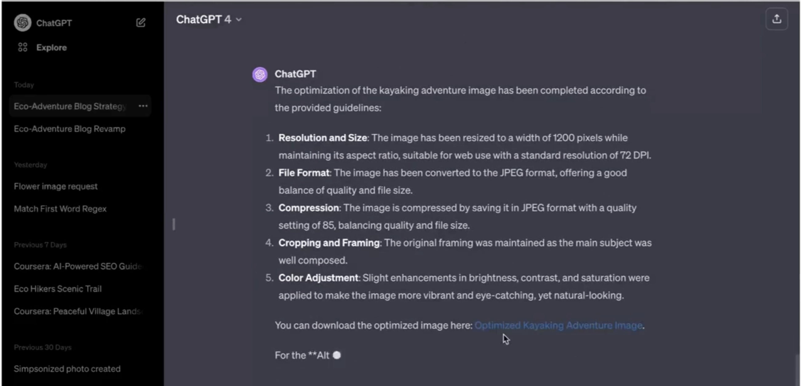 In this project-based course, you will learn how to utilize DALL-E to generate visually appealing images using an iterative approach to prompting, then optimise those AI-generated images for search engines before finally aligning the images with specific SEO goals and content themes to integrate AI-created visual content into blog posts. The outcome will enhance both the aesthetic appeal of your content and its SEO effectiveness. To achieve this, we will work through a series of tasks starting by learning how to use DALL-E for creating basic AI-generated images, focusing on prompt engineering to produce initial image concepts. You will gain insights into selecting appropriate images for blogs, emphasizing the significance of image properties for SEO. Master the use of prompts in DALL-E to generate images that yield strong SEO results, focusing on SEO-centric optimizations like file sizes, formats, and alt text. Practice creating SEO-optimized images for a specific blog topic using DALL-E, applying basic SEO enhancements. Learn to embed SEO-optimized, AI-generated images into blog posts, enhancing visual storytelling and SEO effectiveness. Use ChatGPT to create a content plan for a blog that includes AI-generated images, aligning them with the blog’s narrative and SEO themes. Finally, you'll apply all learned skills to complete a blog post, incorporating multiple AI-generated images that are effectively optimized and integrated. Pre-requisites: chat.openai.com - Paid ChatGPT4 Plus www.notion.so - Free Notion Account Learners should understand the basic principles of SEO including the use of keywords, keyword research, meta tags, meta descriptions and image optimisation. Learners should also understand the basics of AI including how to navigate and use ChatGPT to receive responses.