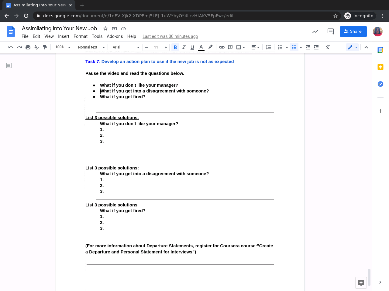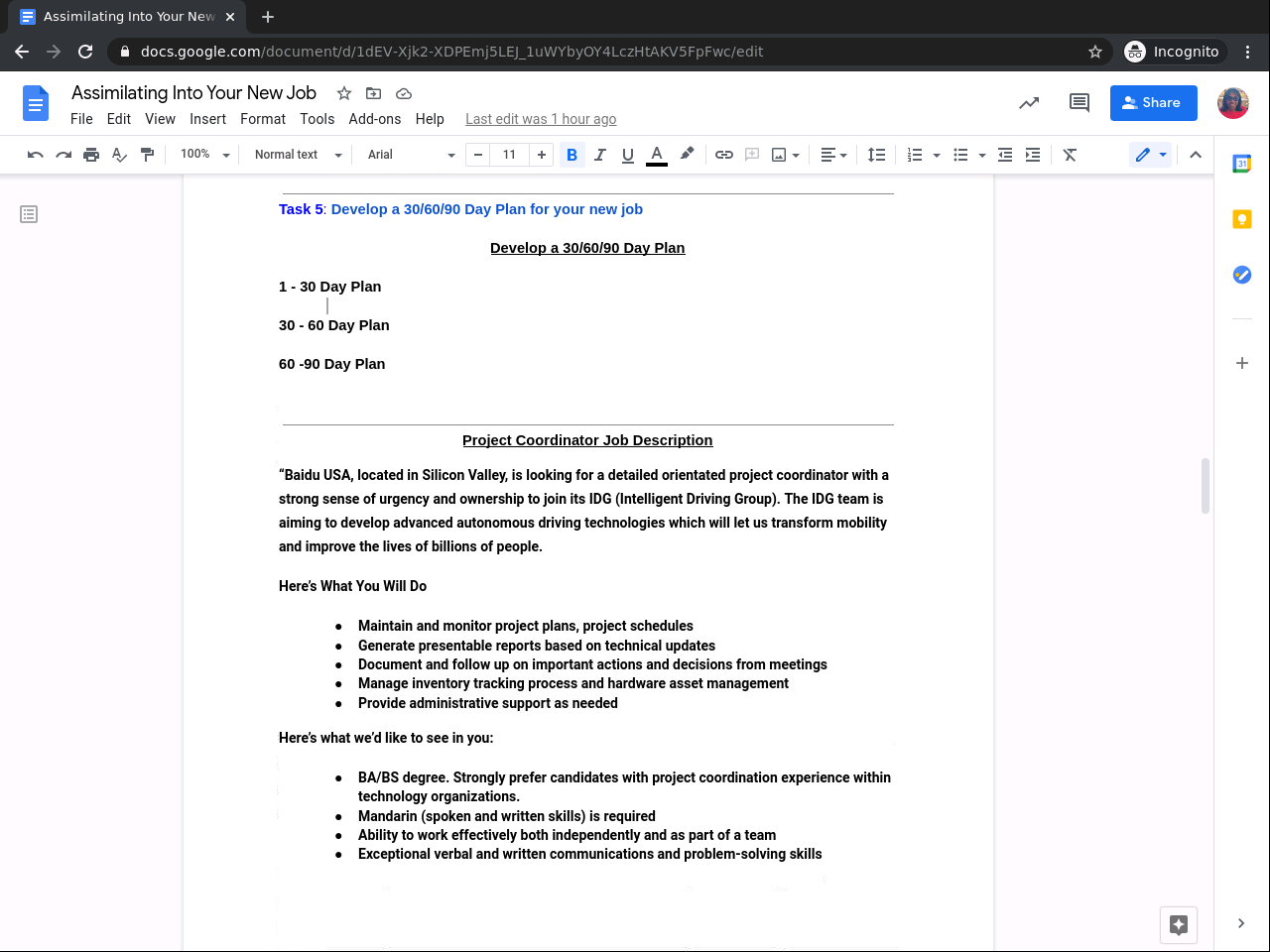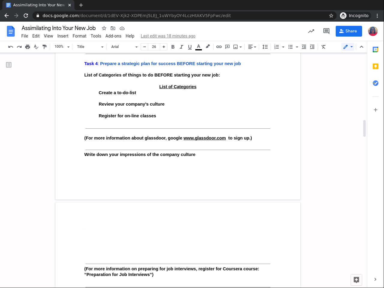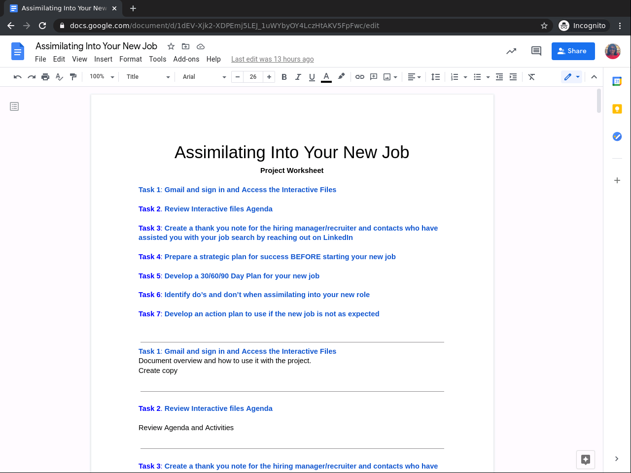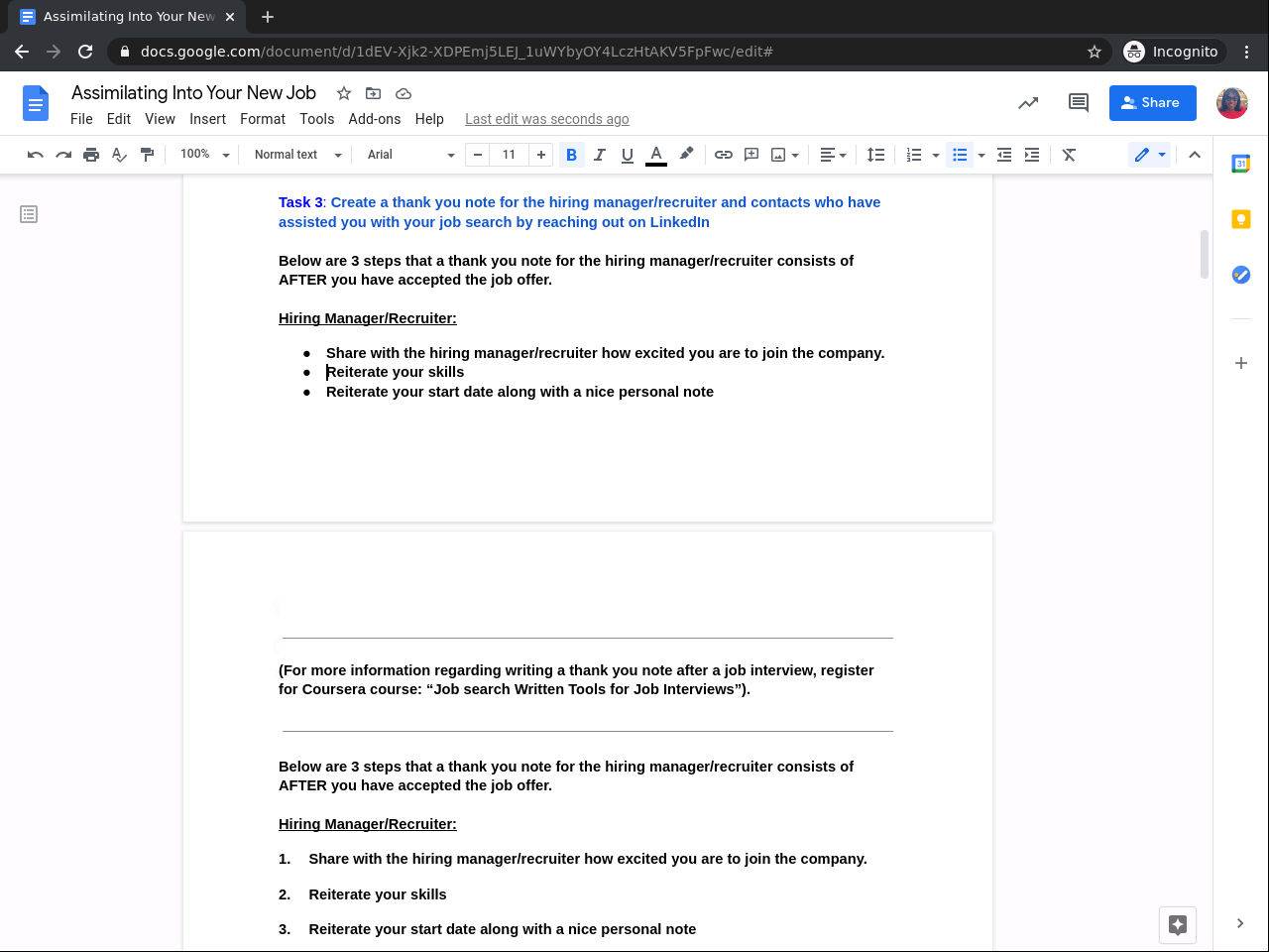 1. Create a thank you note for the Hiring Manager/Recruiter and Contacts 2. Prepare a strategic plan for success BEFORE starting your new job 3. Develop a 30-60-90 Day Plan for your new job Assimilating into a new job is one of the most important steps of completing your job search. It requires a understanding of the company culture; build strong team member relationships and maintaining good communications with your hiring manager by setting expectations in your new role. Note: This course works best for learners who are based in the North America region. We’re currently working on providing the same experience in other regions.