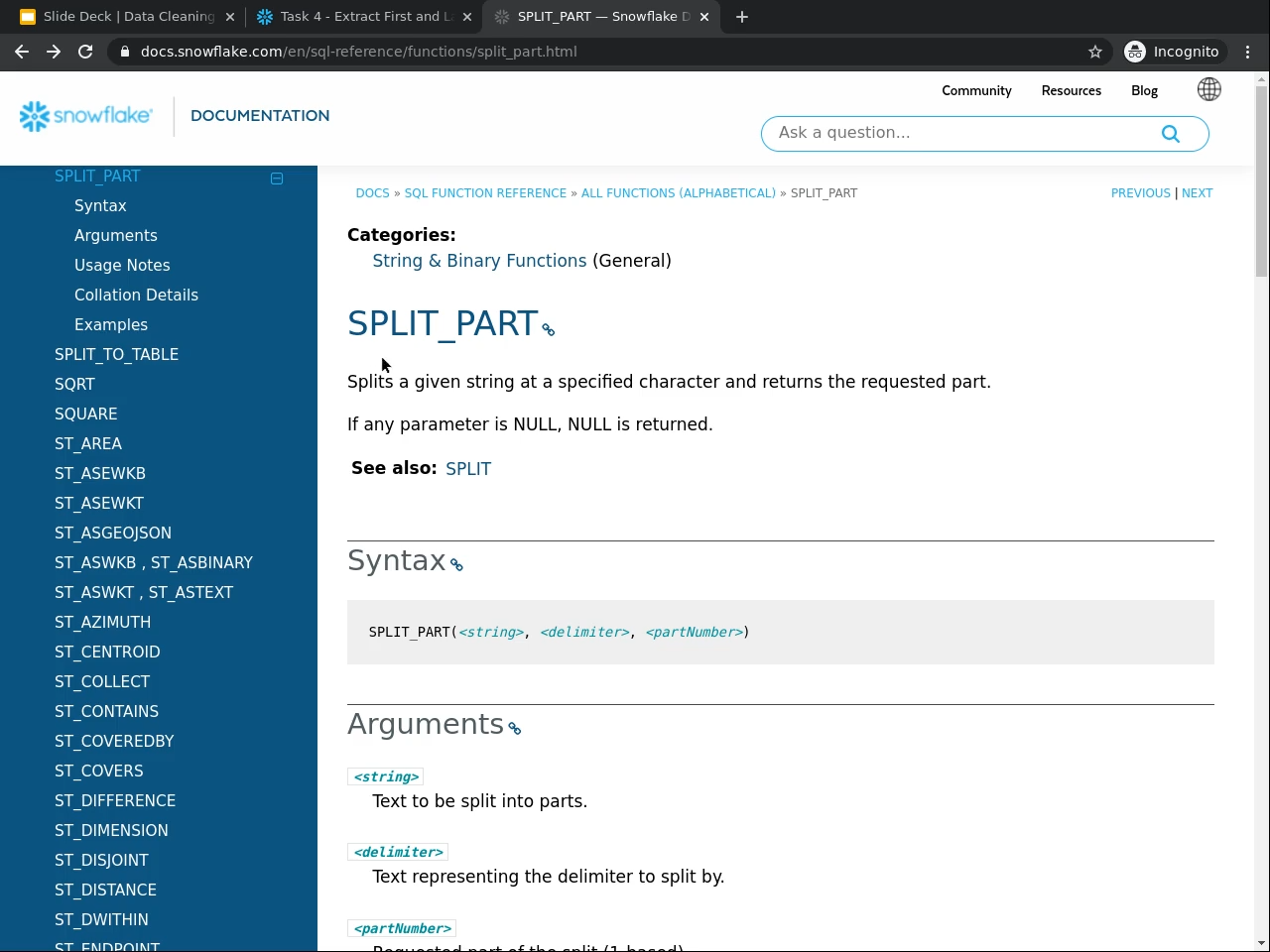 Use Snowflake UI to identify data quality issues then use SQL String functions to remove unwanted characters and split rows into multiple columns.