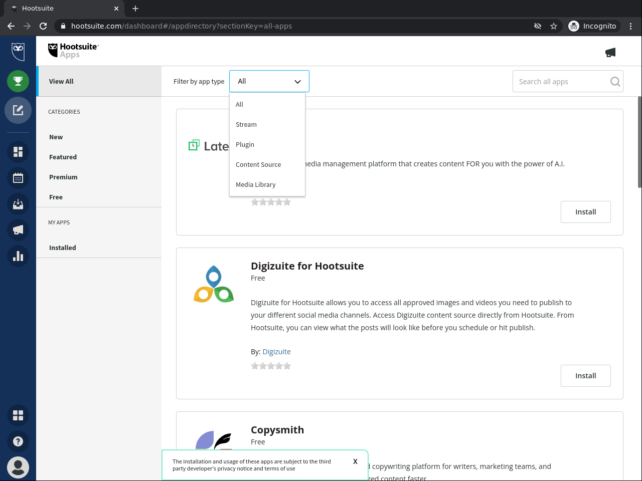 • You will be able to discover the different types of apps that you can install on Hootsuite.