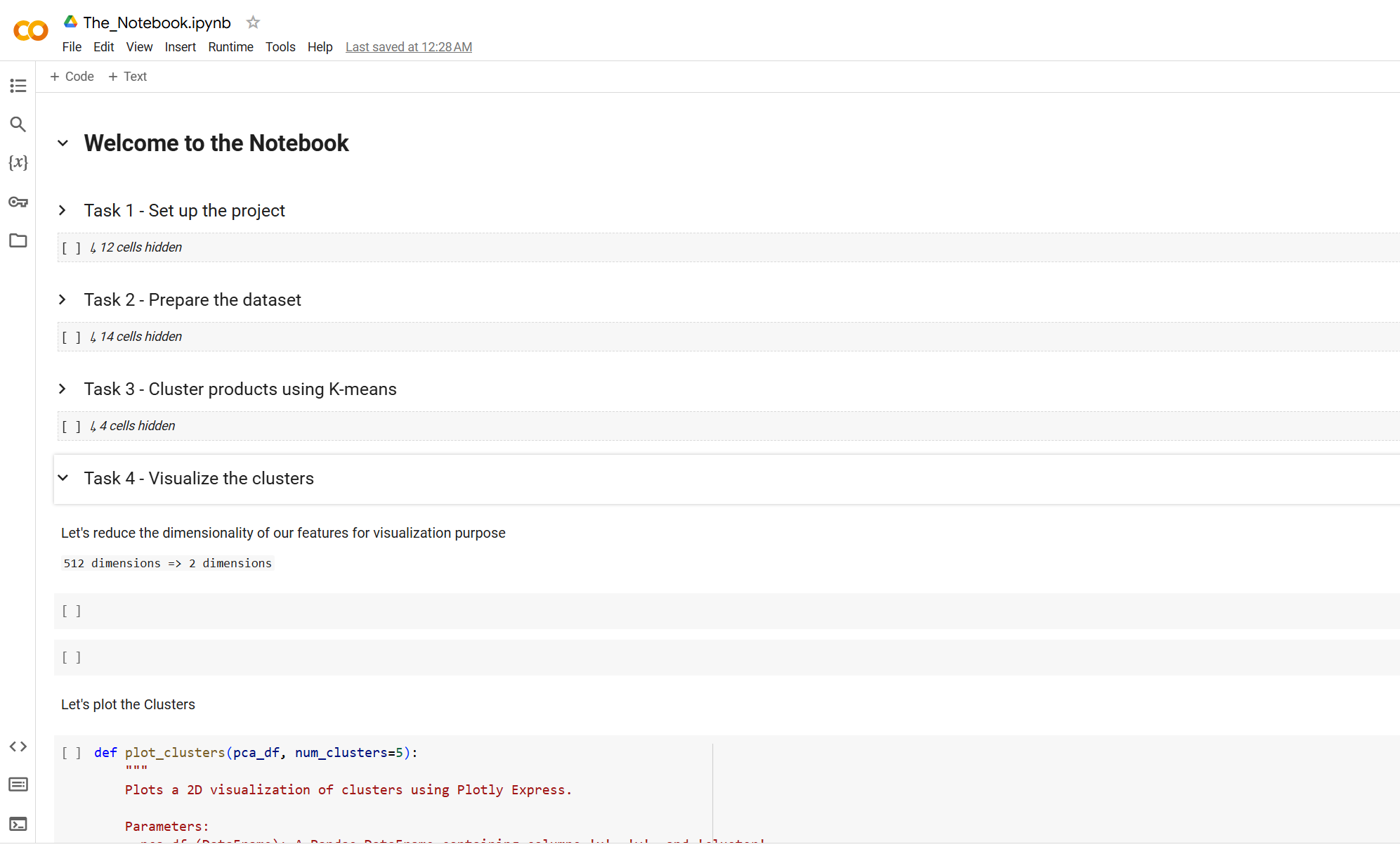 • Use K-means with OpenAI embeddings to cluster similar products and visualize.
