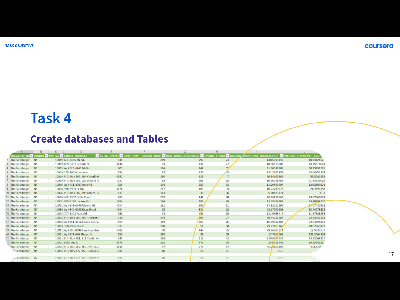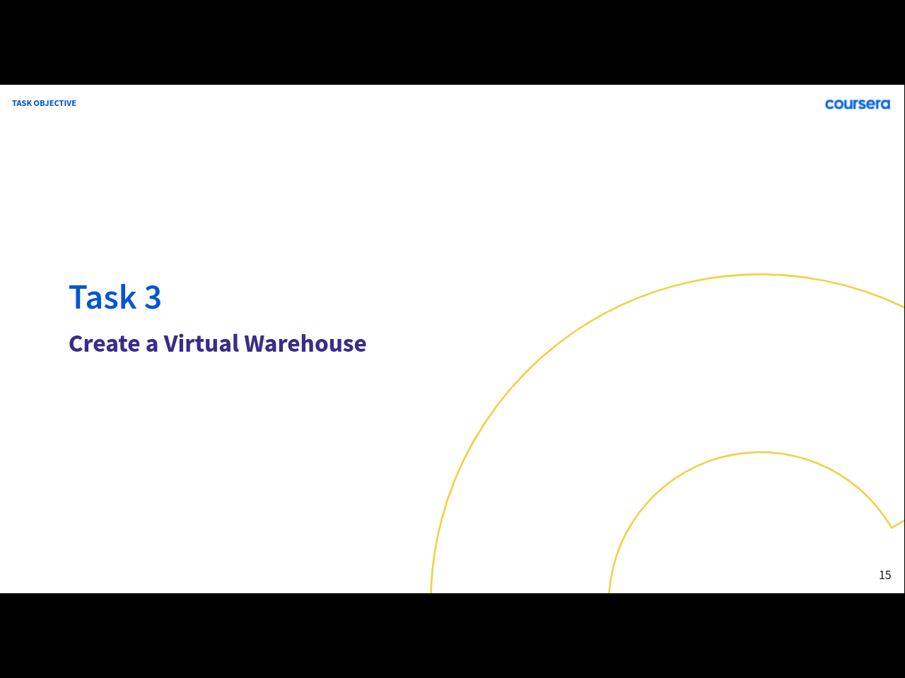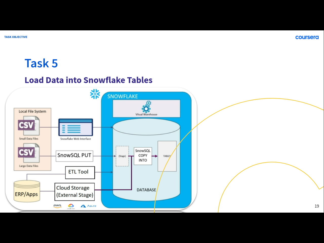Create a virtual warehouse, a database and tables and you will load data into Snowflake.