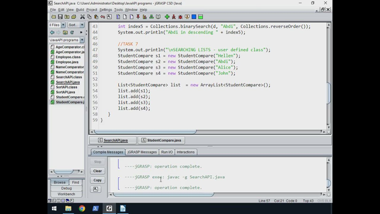 In this project, the learner will use the Java API to sort and search arrays and lists by implementing the Collections sort function, the binarySearch function, and the Comparator and Comparable interfaces.
